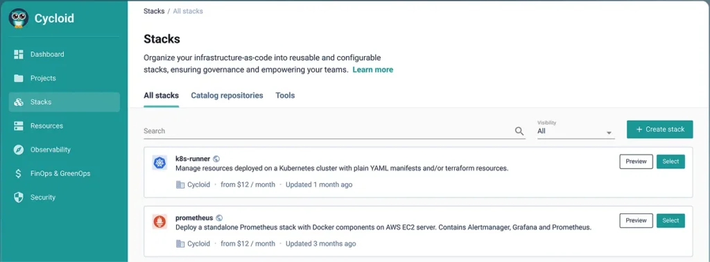 With Cycloid's customizable end to end solution, you'll see the potential of platform engineering for your organization in weeks, not years. Start by managing your service catalog directly from your Git repository. Cycloid takes a full GitOps approach with your git the source of truth. Create IAC from your existing infrastructure or create a stack from a predefined blueprint. Push this stack to your Git catalog repository. Customize your user experience with our stack forms editor. Use drop down menus to select a cloud account to auto complete widgets that fetch options from APIs. Drop down options adapt based on previous selections. Conditionally display advanced fields to streamline user interactions with Cycloid asset inventory widget. Multi tenancy capabilities let service catalogs be shared with multiple orgs, enforce multi factor authentication to meet security rules, configure Terraform back end, maintain brand consistency, implement RBAC for governance. It's easy for end users to deploy infra and apps. Select a stack from your service catalog. Optionally, select your preferred cloud provider. Configure your deployment as needed according to the guardrails as defined by your platform team. Use the cycloid asset inventory widget to integrate cloud resources with each other. Estimate infrastructure costs before deployment for budget compliance. End user configurations are securely saved back to your gift. Here, Cycloid serves as an internal developer portal and platform. Cycloid's asset inventory maintains visibility into deployed infra resources. The FinOps module provides cost analysis and opportunities for optimization. Cycloid helps you monitor and reduce carbon emissions, reinforcing your sustainability goals. Cycloid, it's platform engineering done right.