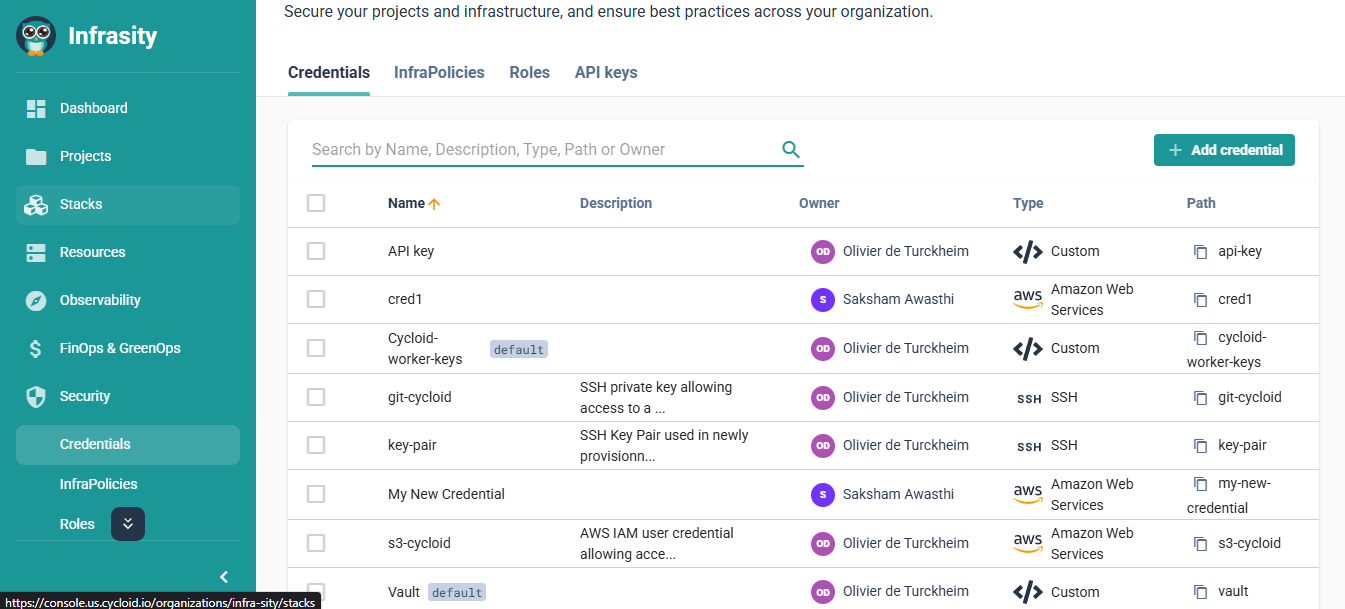 This screenshot clearly visualises credential management consolidation provided by cycloid.