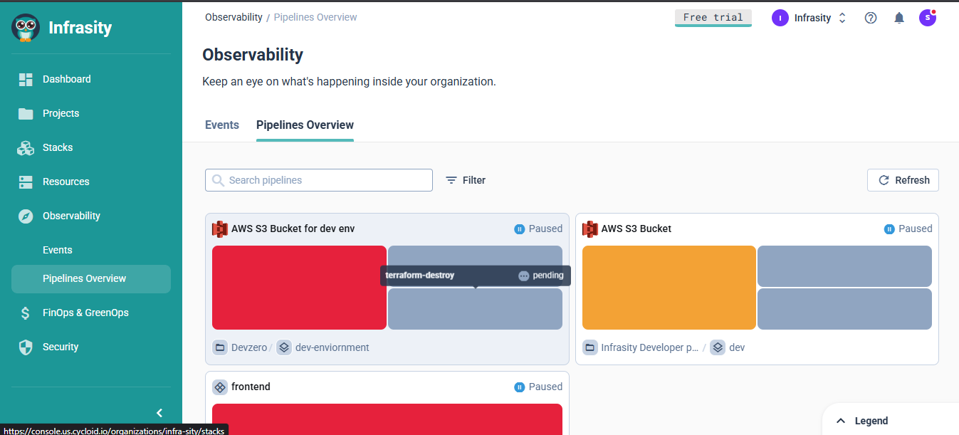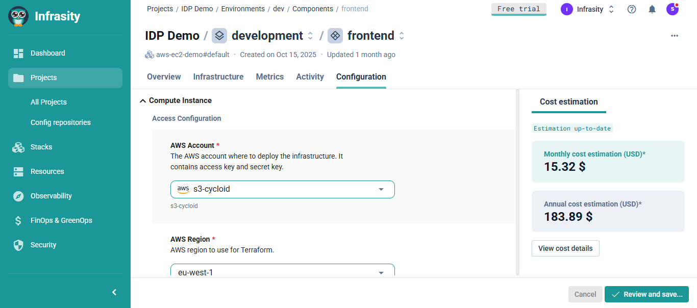 Experience Developers switch between several tools to understand deployments, costs, environment state, and compliance signals. Information stays in one place. Developers track progress, understand changes, and make decisions without searching across systems. Project views combine workflow history, deployment status, cost data, and governance signals in a single interface.