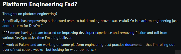 At the same time, community conversations on Reddit make one practical point clear: platform initiatives can succeed only if they reduce developers’ cognitive load rather than add another layer of bureaucracy, threads such as “Platform Engineering Fad?” and related discussions repeatedly surface complaints about platforms that centralize control without usable self-service.