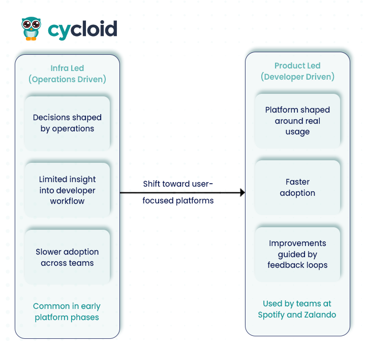 Every platform team eventually must choose whether the platform’s direction will be driven by operational priorities or by developer needs. Infra led platforms begin with standardizing tools, pipelines, and infrastructure governance. This path creates structure, but it often results in a platform that mirrors how operations teams prefer to work rather than how developers actually build and ship software.
