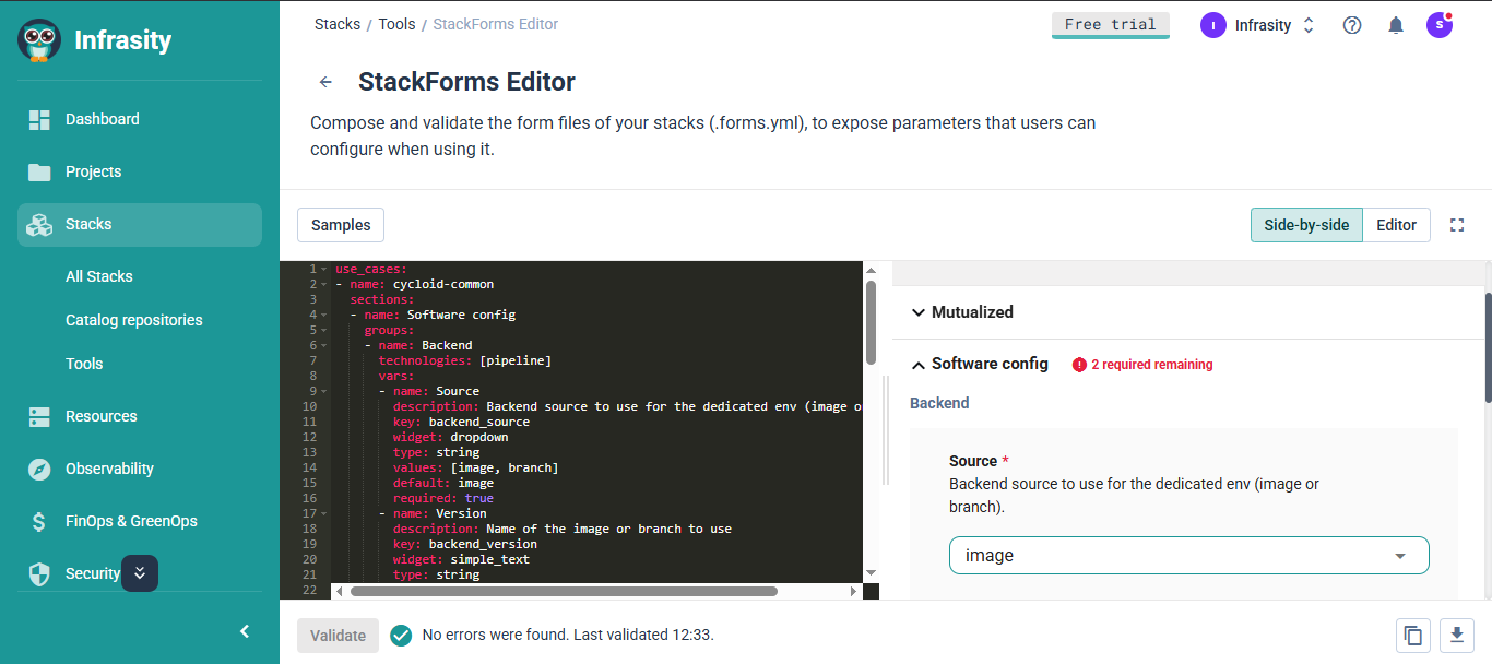 Cycloid supports golden paths and governance by giving platform teams a structured way to define the exact parameters developers can use when provisioning through a stack. In the StackForms Editor shown above, the .forms.yml file defines fields like backend_source and backend_version, sets allowed values and adds required checks. Cycloid validates these definitions in real time and generates a matching form on the right side, so developers only interact with approved, validated inputs. This keeps workflows consistent and prevents teams from introducing their own variations, while still giving developers a straightforward and predictable interface.