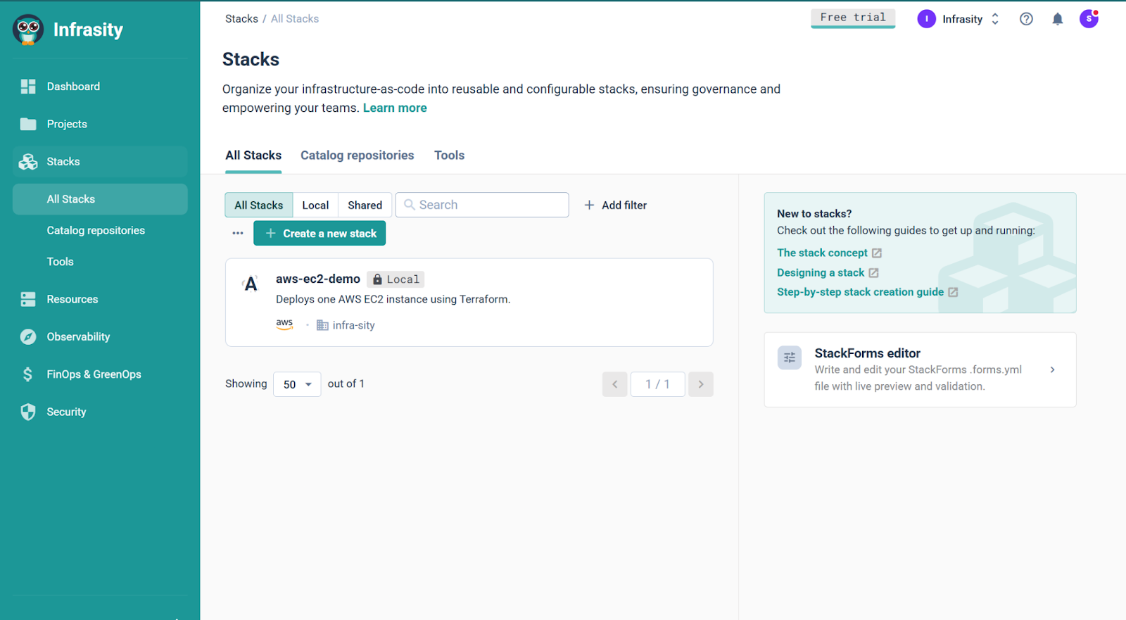 The Stacks view gives teams one place to define infrastructure, validate inputs and expose safe templates to developers.