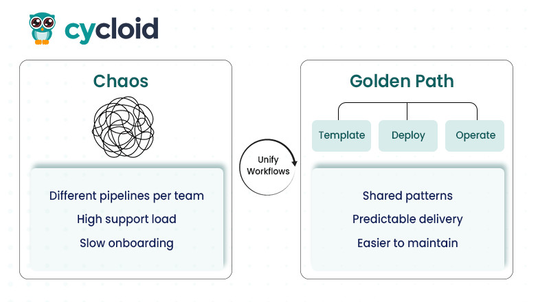 When teams adopt self-service workflows, the next challenge often arises: developers start creating unique deployment patterns, pipelines, and infrastructure configurations. At first this seems flexible, but over time these variations accumulate. Support and onboarding begin to suffer, incident response slows down, and maintaining shared standards across teams becomes difficult.