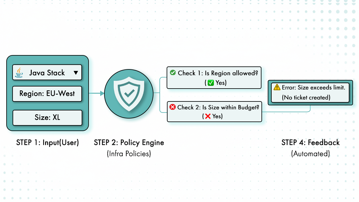 Region choices are constrained. Environment types are predefined. Cost and capacity limits are applied automatically. When a request violates a rule, feedback is immediate and specific. There is no waiting for an approval because the platform already enforces the boundary.
