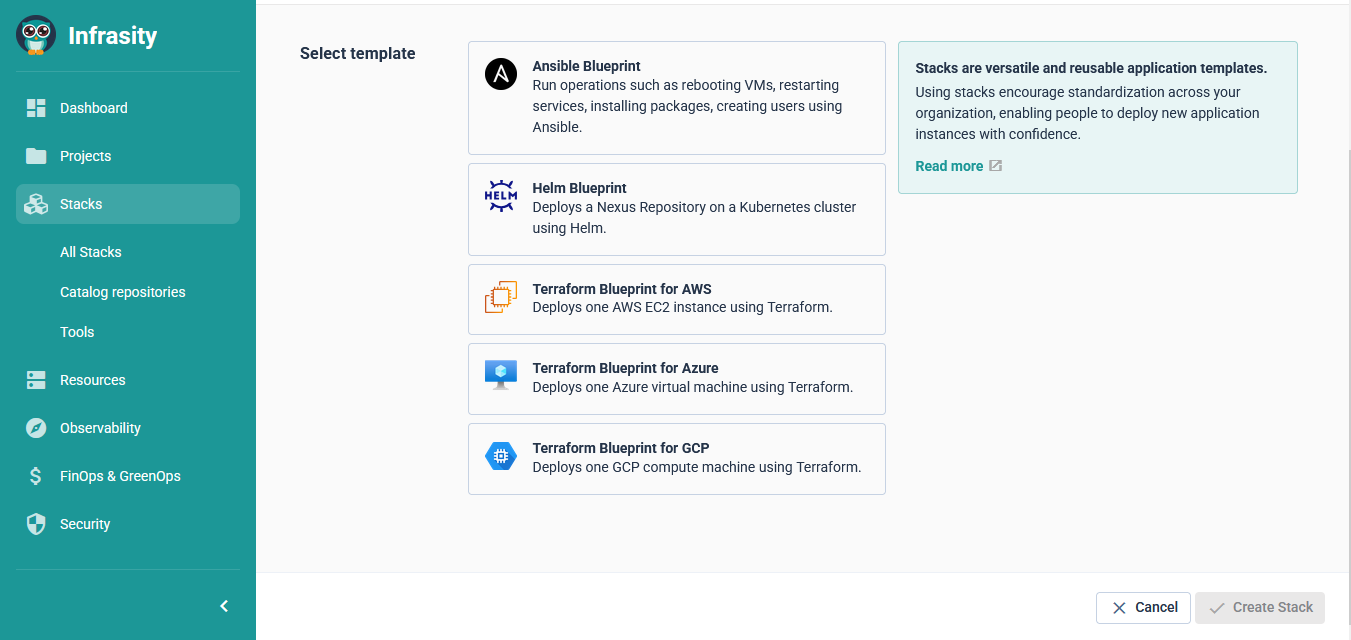 - Stacks provide a single interface to deploy across any provider (Terraform/Helm/Ansible).