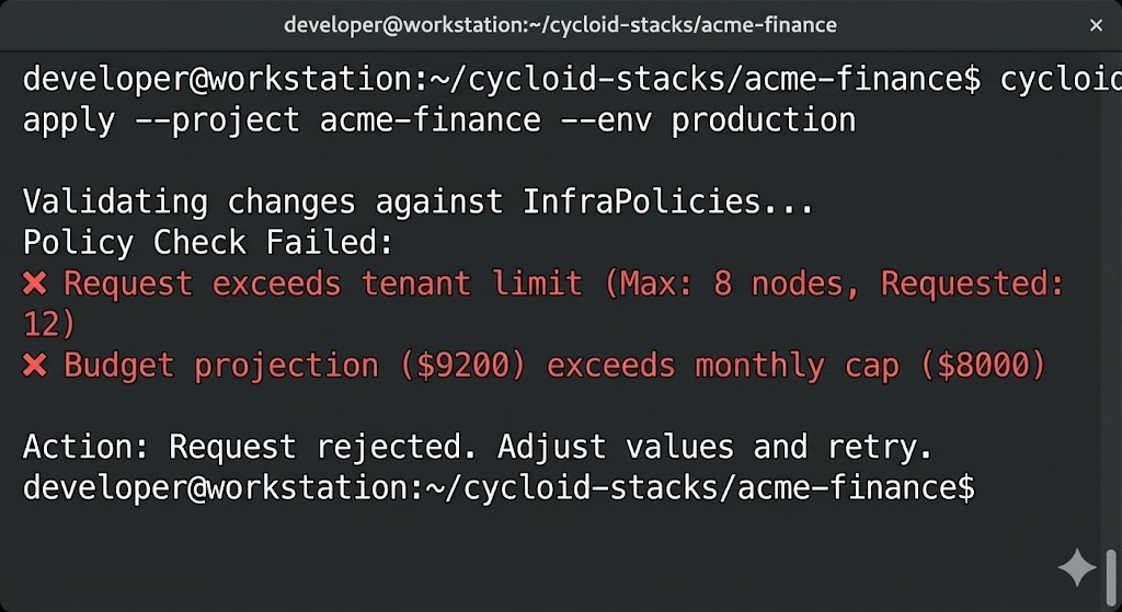 What happens when the request violates a rule: Instead of a ticket sitting in a queue for 4 hours, the engineer gets instant feedback in the terminal: