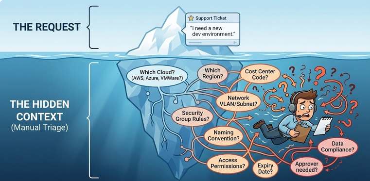A mid-sized MSP running fifteen enterprise customers across bare metal, on-prem VMware, AWS, OpenShift, and Azure does not fail because of technology choice. It fails because traditional change management processes turn every network change, environment request, cost question, or compliance check into a ticket in platforms like ServiceNow, forcing manual coordination across disconnected tools, teams, and calendars.