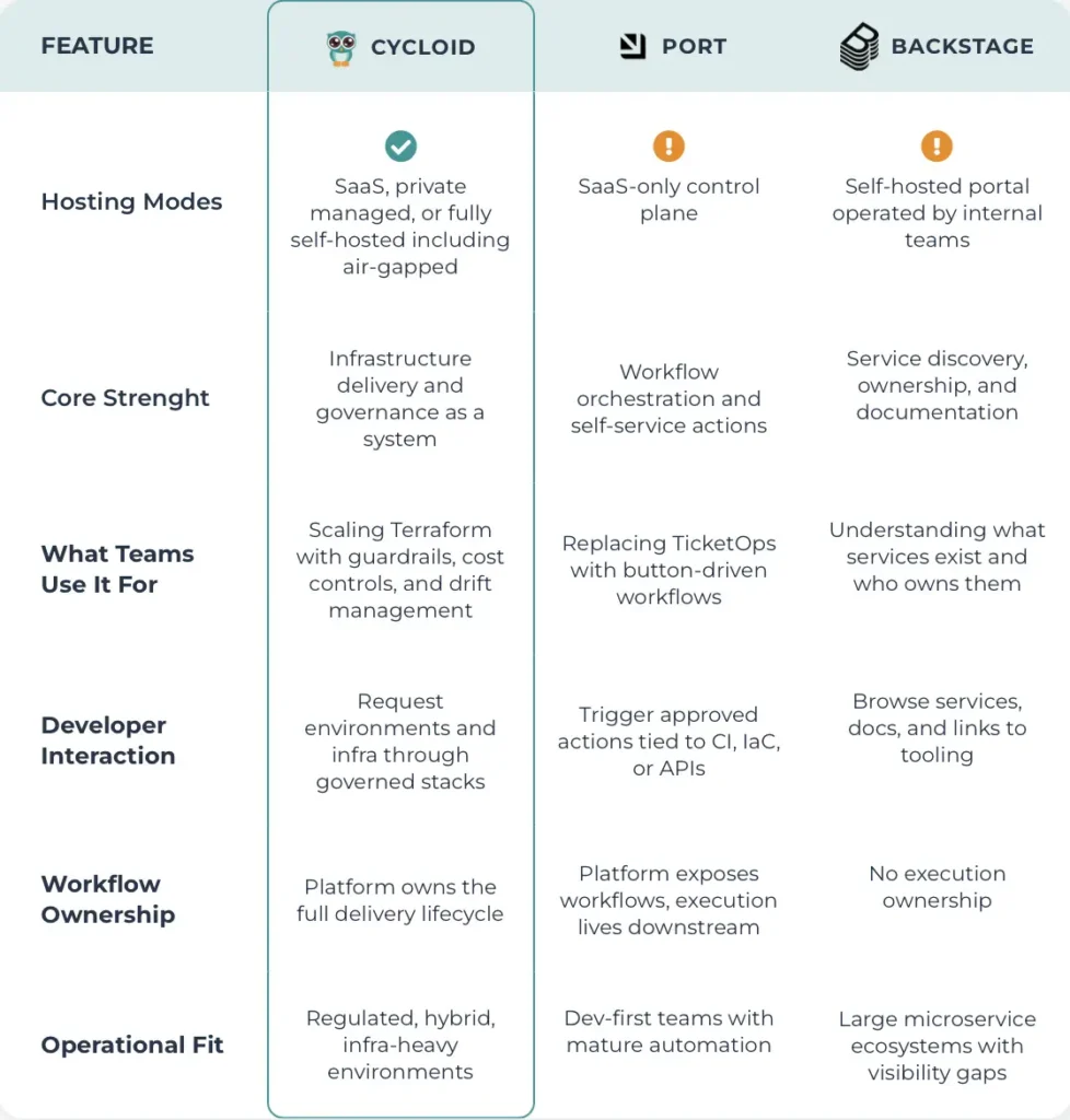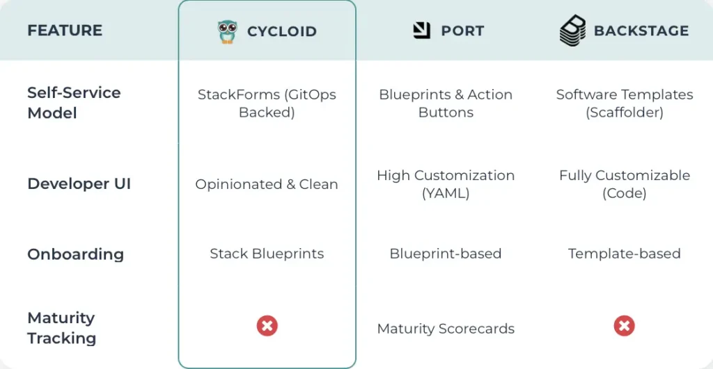 Feature Comparison: Cycloid vs Port vs Backstage