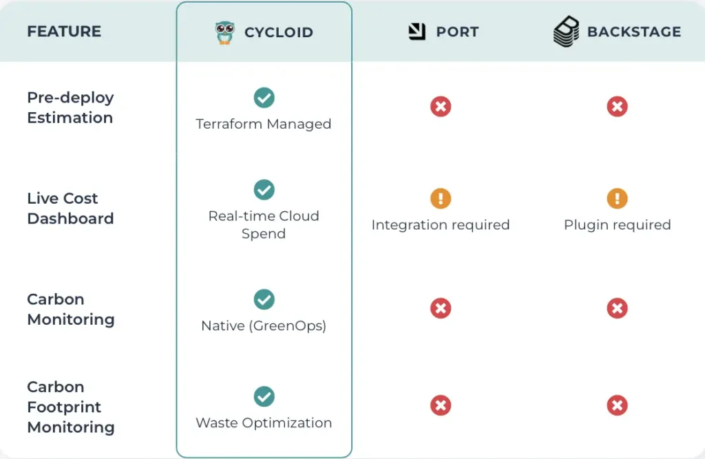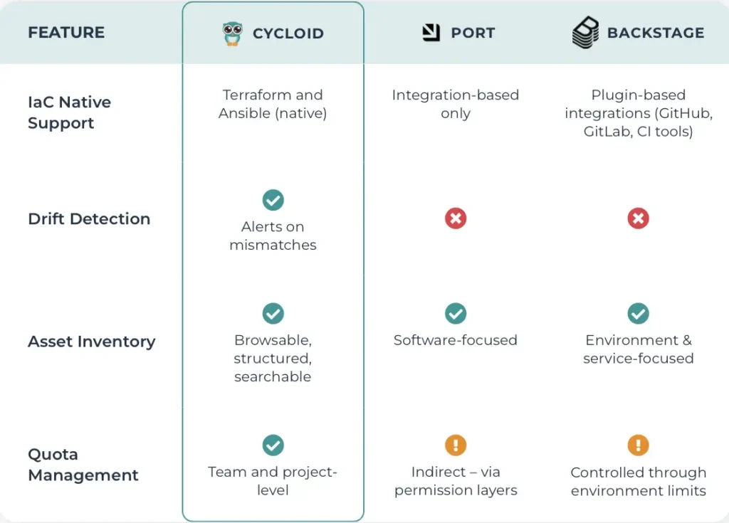 This category compares how Cycloid, Port, and Backstage approach infrastructure state, resource visibility, and control as scale increases.