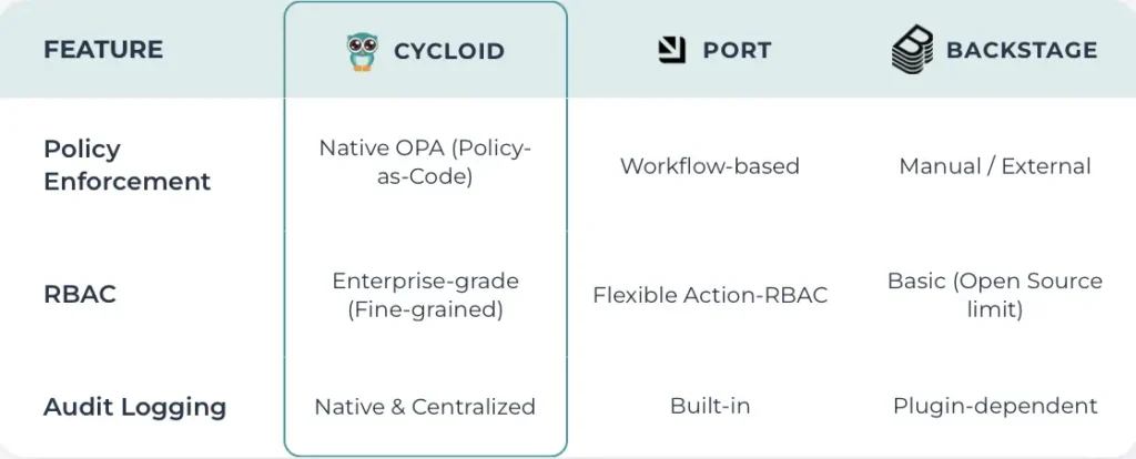 This section compares how Cycloid, Port, and Backstage handle access control, enforcement, and guardrails in real delivery workflows.
