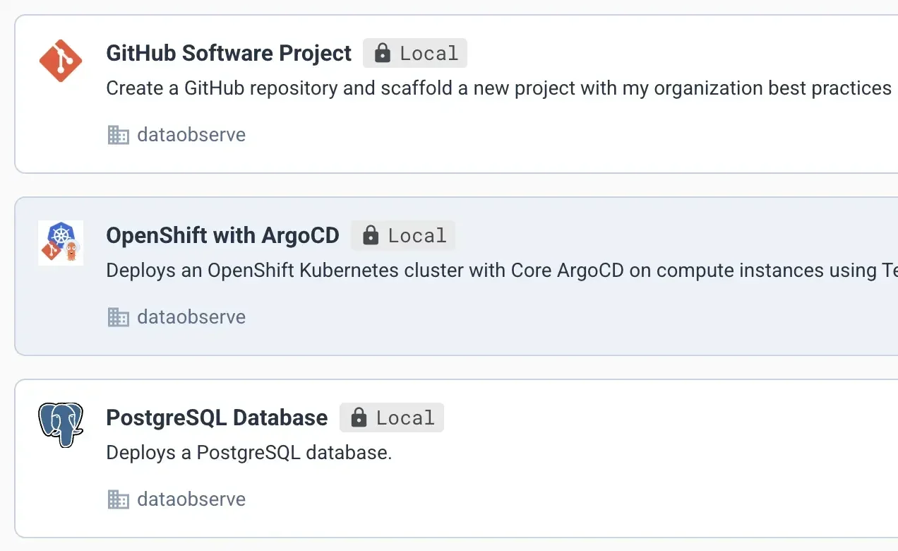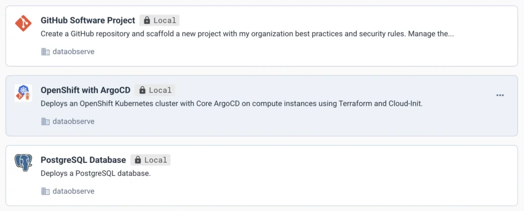 Les développeurs parcourent le catalogue et déploient l’infrastructure en quelques minutes, tandis que les équipes plateforme assurent la gouvernance grâce à des Stacks versionnées et auditables, stockées dans Git.
