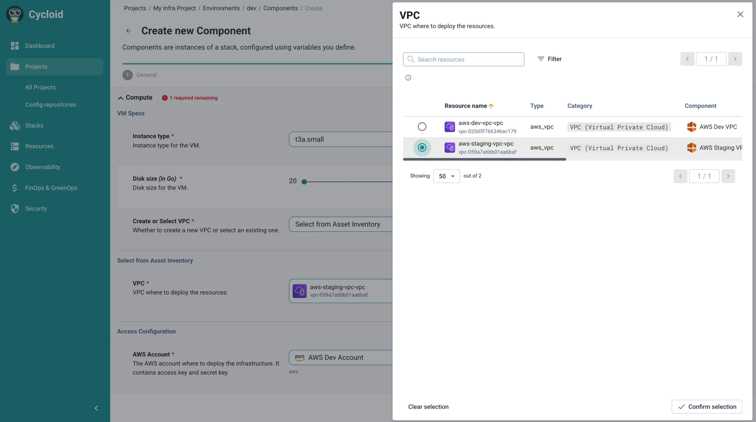 StackForms is a self-service portal that acts as the glue between your workloads, ensuring your services work end-to-end. Here’s an example: Cycloid deploys your compute and storage workloads where the end-user selects a landing zone, either through Cycloid asset inventory or using your cloud provider API. Additionally, it provides cost estimation, giving users visibility into the financial impact of their infrastructure choices. Infrastructure made easy and cost-effective!